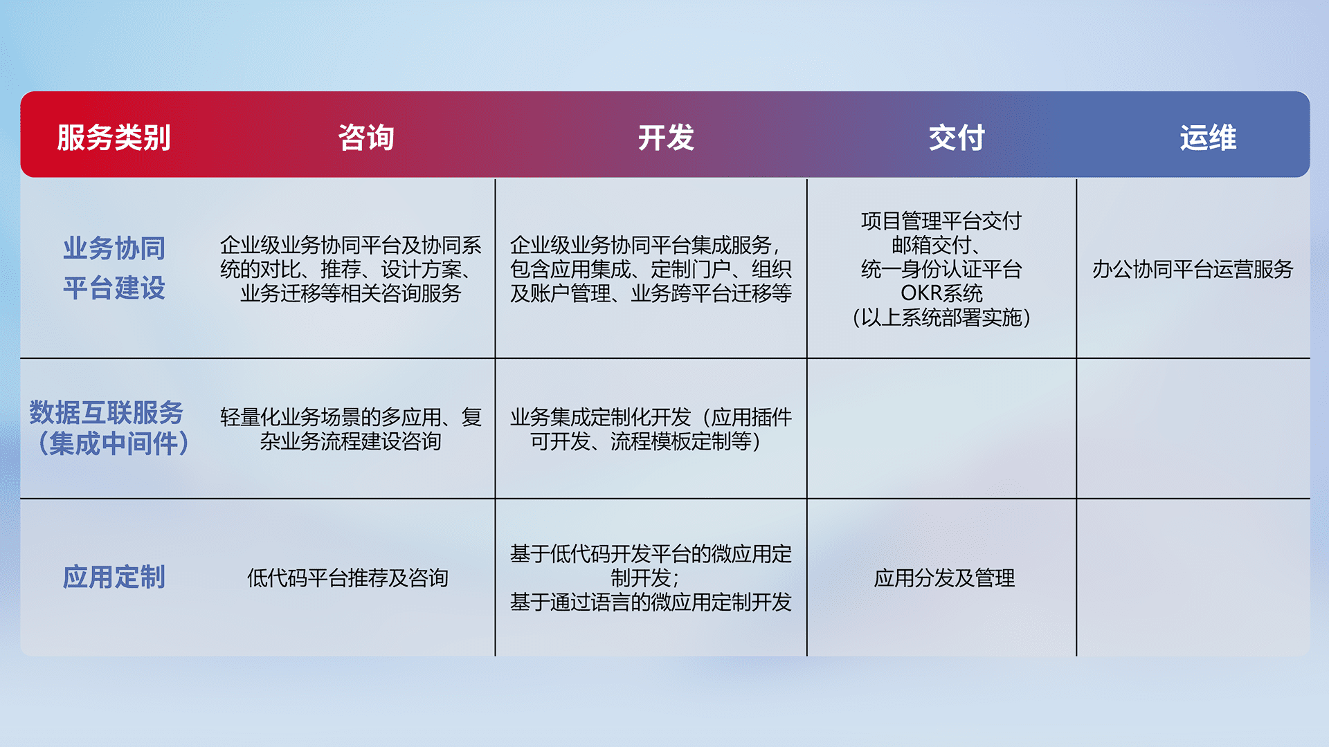 针对钉钉、、、企微、、IDaas等平台级产品提供产品的规划、、方案、、、、交付、、、、定制化开发等服务,,实现如统一协同办公、、、、智能客户服务、、混合会议管理、、、智能数据查询、、、、等业务场景,,实现数字化转型。。。